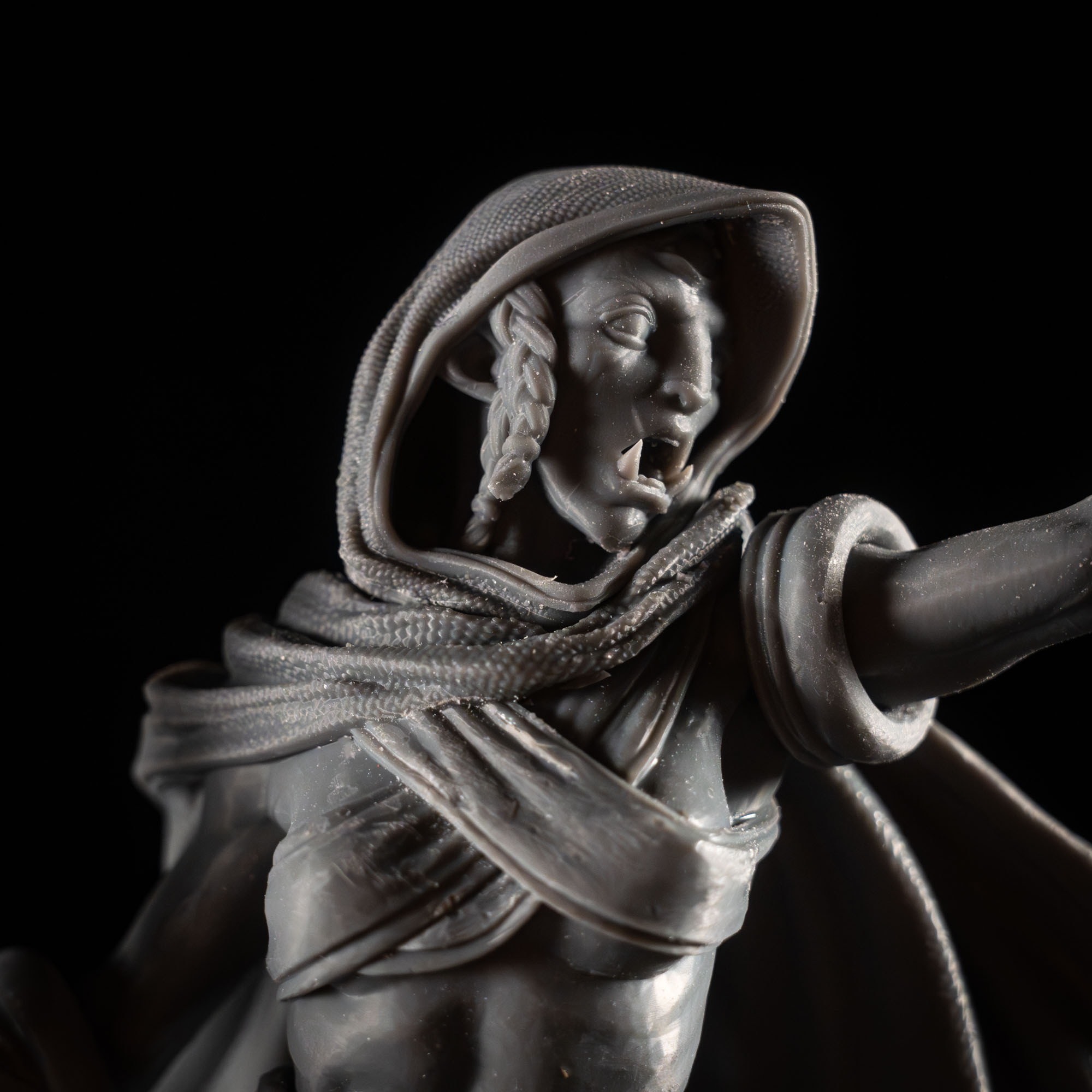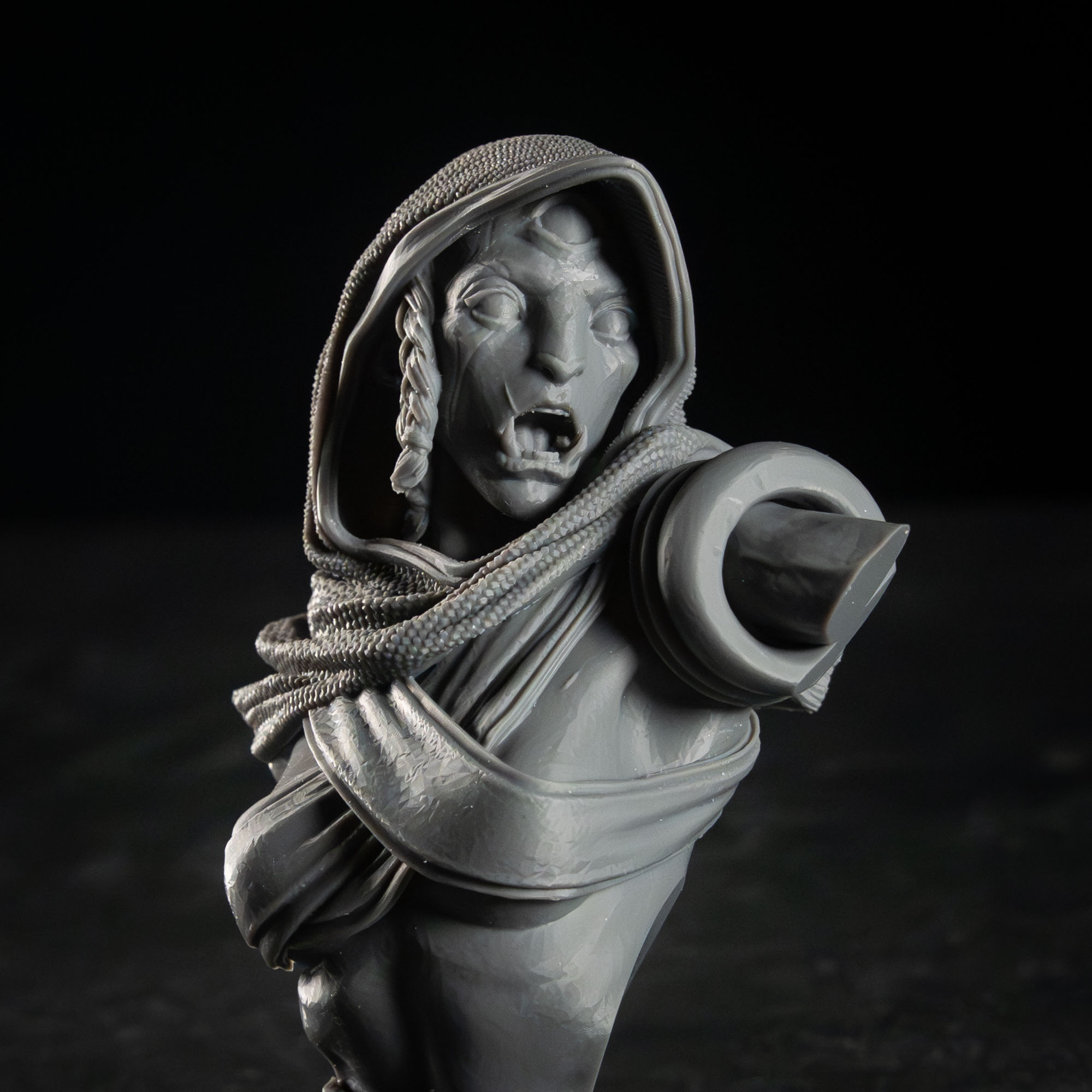 A high-detail 3D printed bust miniature designed for display. With sharp facial features, expressive sculpting, and a smooth finish, it’s the perfect piece for collectors and painters who want a striking showcase bust.